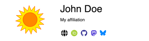 Here is an example of some HTML code that provides your affiliation, along with icons for your website, ORCID iD, Mastodon account, Github account and Bluesky account: